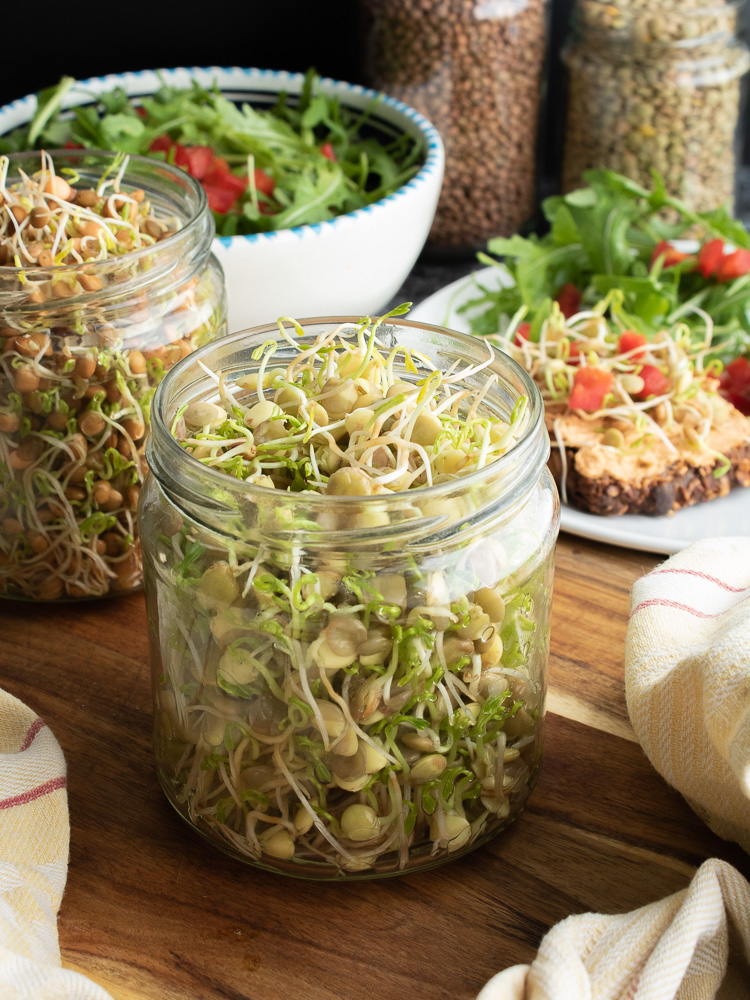 Nach zwei Tagen könnt ihr die Sprossen schon “ernten” und als Topping auf euer belegtes Brot, im Salat oder in einer Bowl verwenden. Je länger ihr die Sprossen keimen lasst, desto weiter wachsen sie.